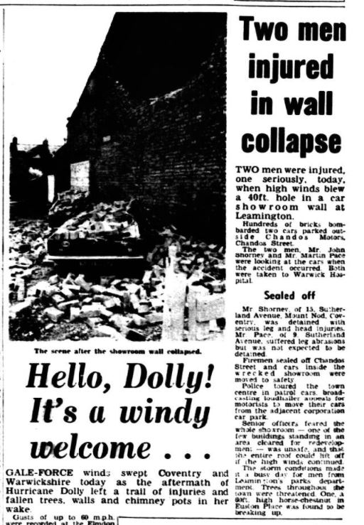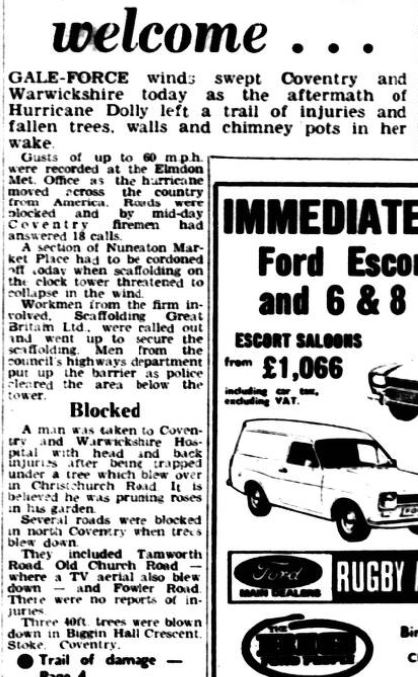 On Saturday, September 7th 1974 the remnants of tropical storm Dolly cause chaos throughout Warwickshire, with wind speed gusts of 60mph being recorded at Elmdon Airport.