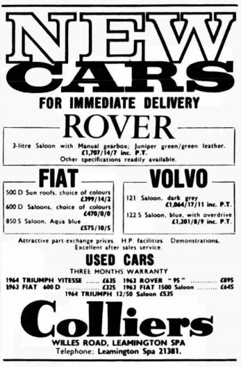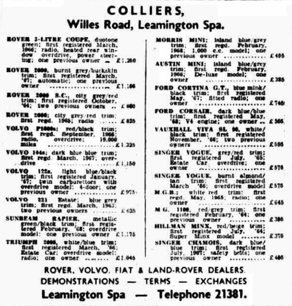 So who remembers “Colliers of Leamington” that was the Rover, Land Rover, Volvo and Fiat dealership around 1965 – 1973? on Willes Road.