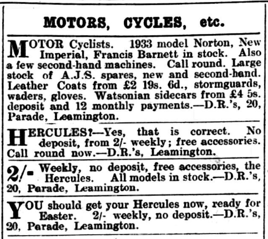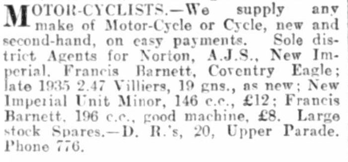 D. R.’s Motor Cycles – 20 Upper Parade Leamington 16 July 1937