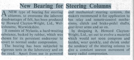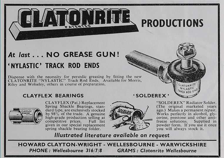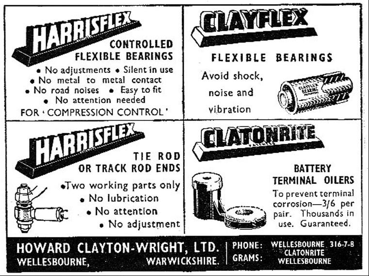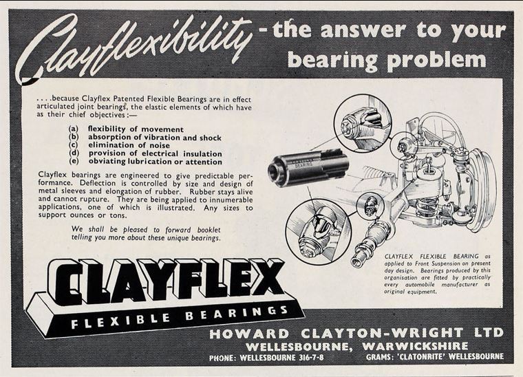In 1958 they produced the patented Clayflex “bearings” in Nylon and Rubber (Same a current Isolastic or Metalastik bushes) for the reducing of road-noise, still used in every modern car today. They were also used in the spring hangers on Series1 and 2 Land Rovers.