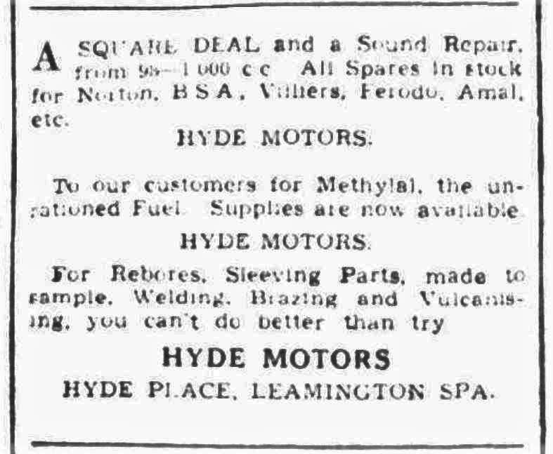 Advert in Courier on August 1948 Hyde Motors, suppliers of spare parts for Norton, BSA, Villiers, Ferodo and Amal.