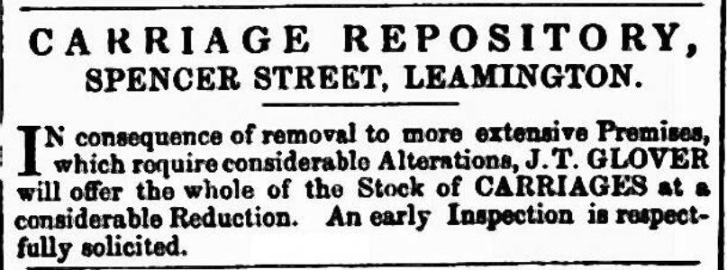 28 April 1888 Formerly for 10-year Manager to the late Mr J.T, Glover, of Warwick and Leamington, BROOK Street. WARWICK.