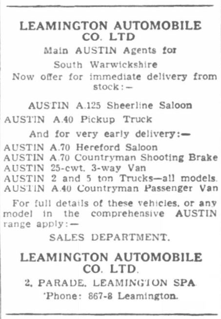 In 1952 Austin and Morris become part of BMC and the photo of Leamington Automobile Co advertises the new Austin A99 first introduced in 1959, the workshop at the side of the building also states BMC Servicing.