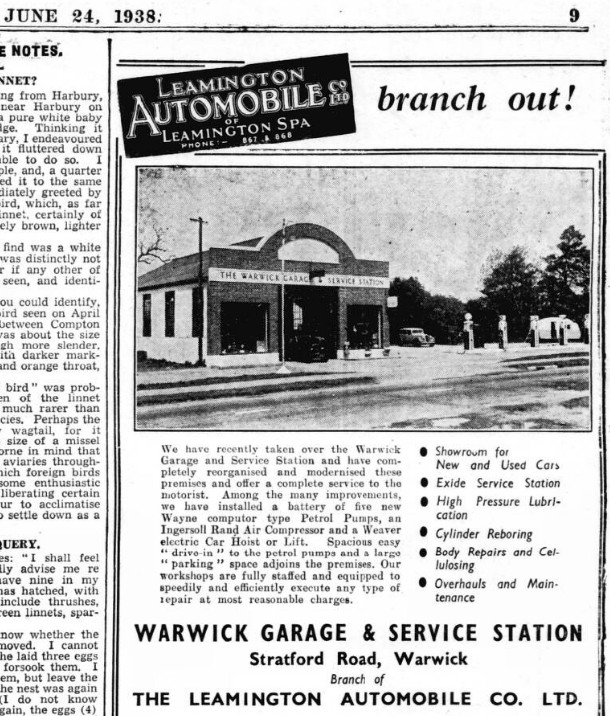 In June 1938, an advert showed they had acquired the Warwick Garage and Service Station on Startford Road. (Later to become Hutfields Coaches).