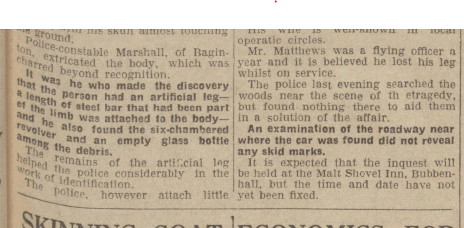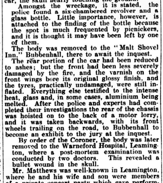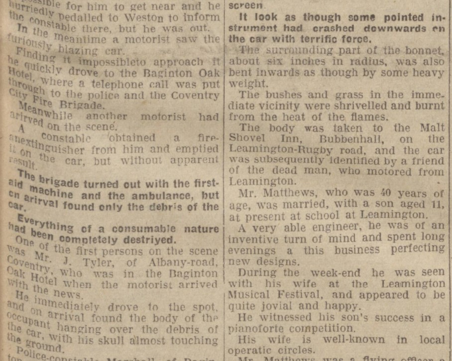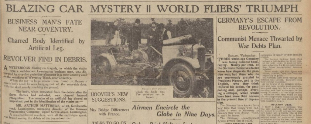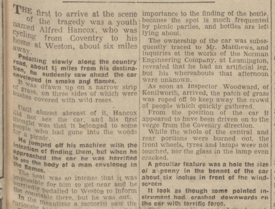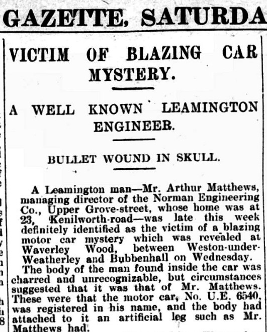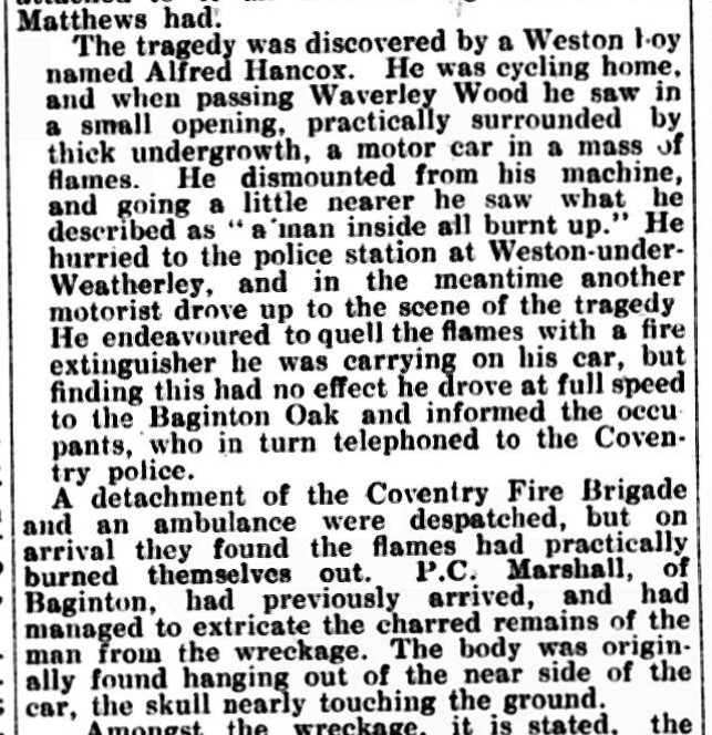 His body was found in a burning Armstrong Siddeley 12hp 2 seater, reg EU6540 in Waverly Wood, nr Bubbenhall.