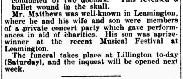 Arthur Matthews of 23 Kenilworth Road, Leamington Spa, died in tragic circumstances on Wednesday 1st July 1931 at the age of 38.