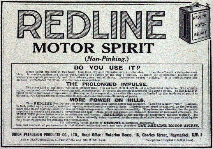 Main Office, Waterloo House, 16 Charles Street, Haymarket, London, producers and distributors of Redline motor spirit.