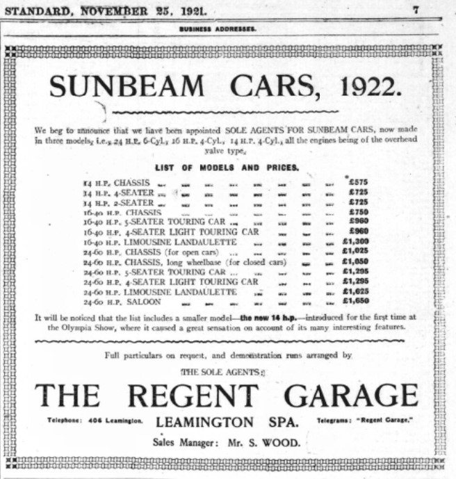In 1922 they are now sole agents for Sunbeam Cars, a Mr S Wood is sales manager.