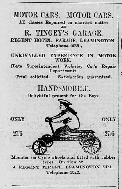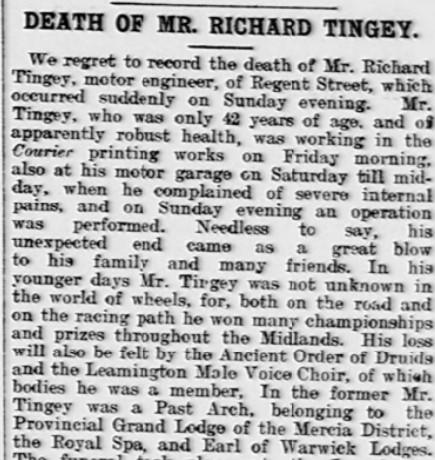 In 1906 the garage was then being run by inventor Richard Tingey of Tingey’s Garage, Regent Hotel who died in June 1909 aged 42 while suffering from stomach pains and then having an operation at the Warnford Hospital.