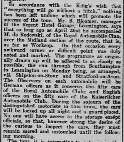 Mr Bertram Bloomer is now manager of the Regent Hotel Garage and on the10 July 1911, the Regent Hotel played host to a party of around 400 members of the Royal Automobile Club of Great Britain and The Imperial Kaiserlicher Motoring Club of Germany, headed by Prince Henry of Prussia driving his own Benz and the Duke of Teek. The garage securely storing the 50 cars overnight, with a guard on duty.