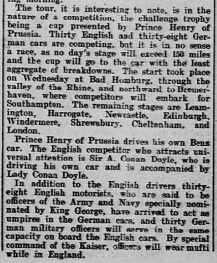 The competition was to cover a course with the least amount of breakdowns, which started at Bad Homburg, near Frankfurt and after a grand tour of England and going as far north as Edinburgh, finished in London.