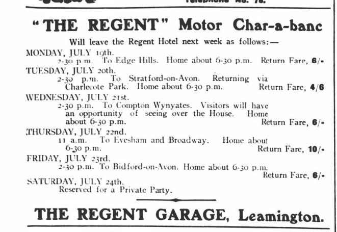 In 1920 the Garage was running Char-a-blanc tours of the area to the likes of Compton Wynyates, Edge Hill and Cheltenham.