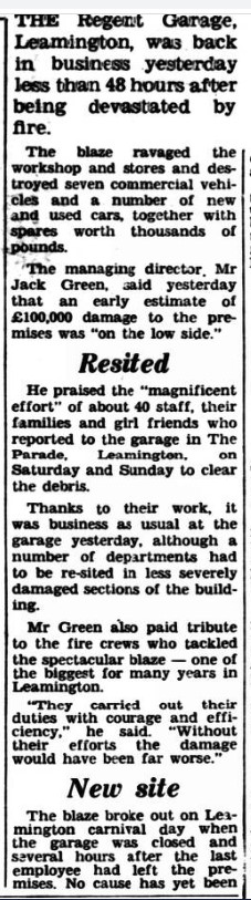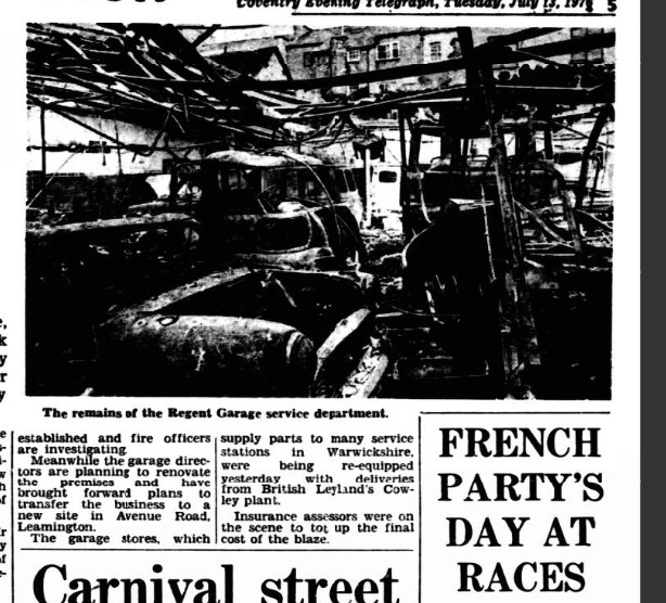 On 10 July 1976, Leamington Carnival day, a fire breaks out destroying the Regent Garage’s Commercial Workshop, the Parts Department and the Stock Control Department, luckily though the area of land left from the demolition of the Avenue Road Railway Station had been already been purchased in 1973 and plans were immediately brought forward to start construction of a new building complex.